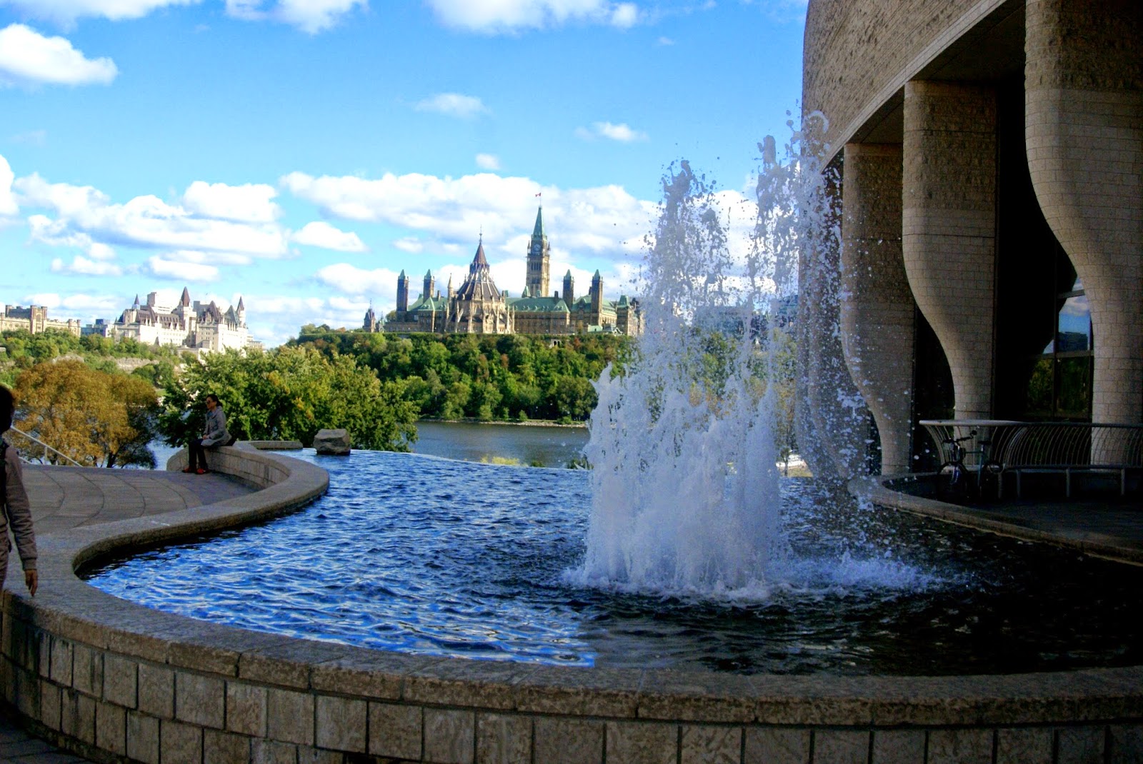 O belo prédio do museu, com suas fontes jorrantes e sofisticados caminhos emolduram um cenário de grande beleza que é a Capital do Canadá do outro lado do rio Ottawa..